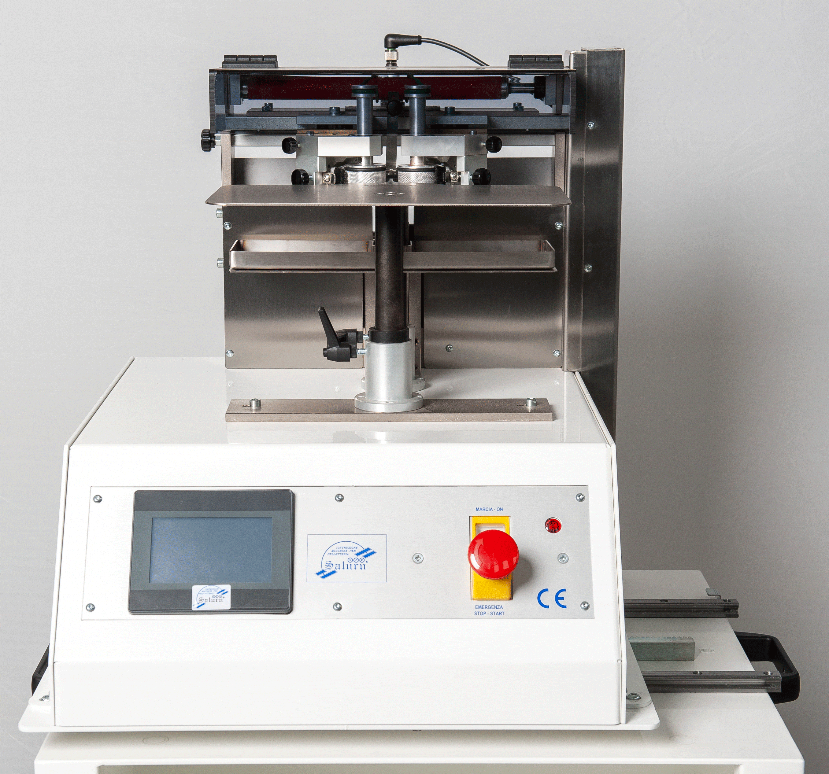 Le due teste coloratrici si muovono indipendentemente e danno la possibilità di colorare anche le punte di cinture con larghezza da 3 a 90 mm.Il modello 765 Touch equipaggiato di sostegno viene ,nella maggior parte dei casi, utilizzato davanti ai forni per cinture (Mod. 7003 “The Bullet”).